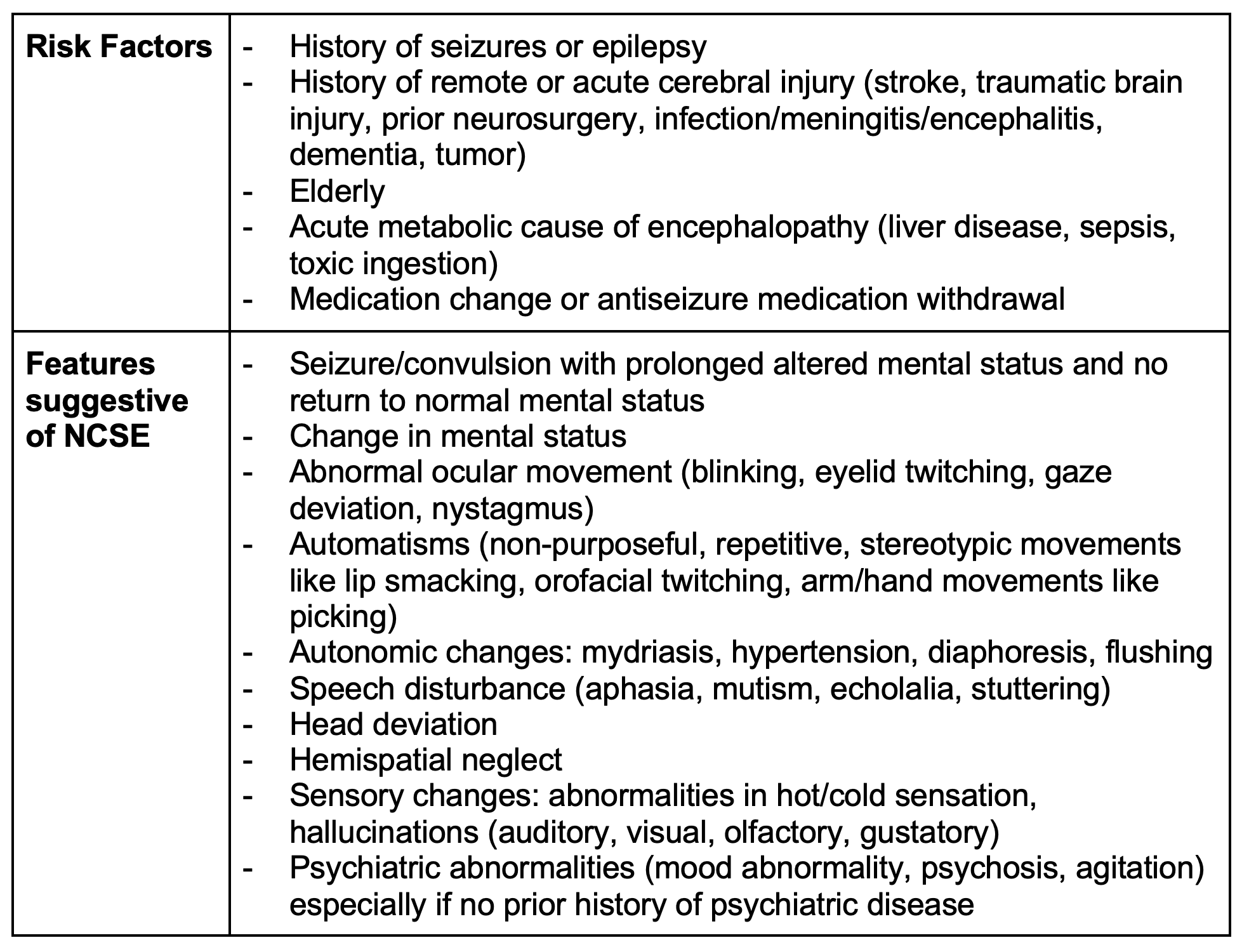 - Think NCSE in those with altered sensorium and abnormal ocular movements such as sustained eye deviation or nystagmus, automatisms such as lip smacking of subtle motor twitches in the face or extremities, and those with a history of seizures/epilepsy or a medication history with an antiepileptic.