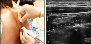 Injection technique demonstrated in picture A, needle placement visualized in picture B between the transverse process and erector spinae (Highland US).12